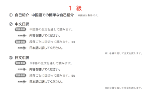 下画像の通り、①自己紹介(採点対象外)、②中文日訳、③日文中訳の3部構成です。①は採点対象ではなく、②③のみが対象です。