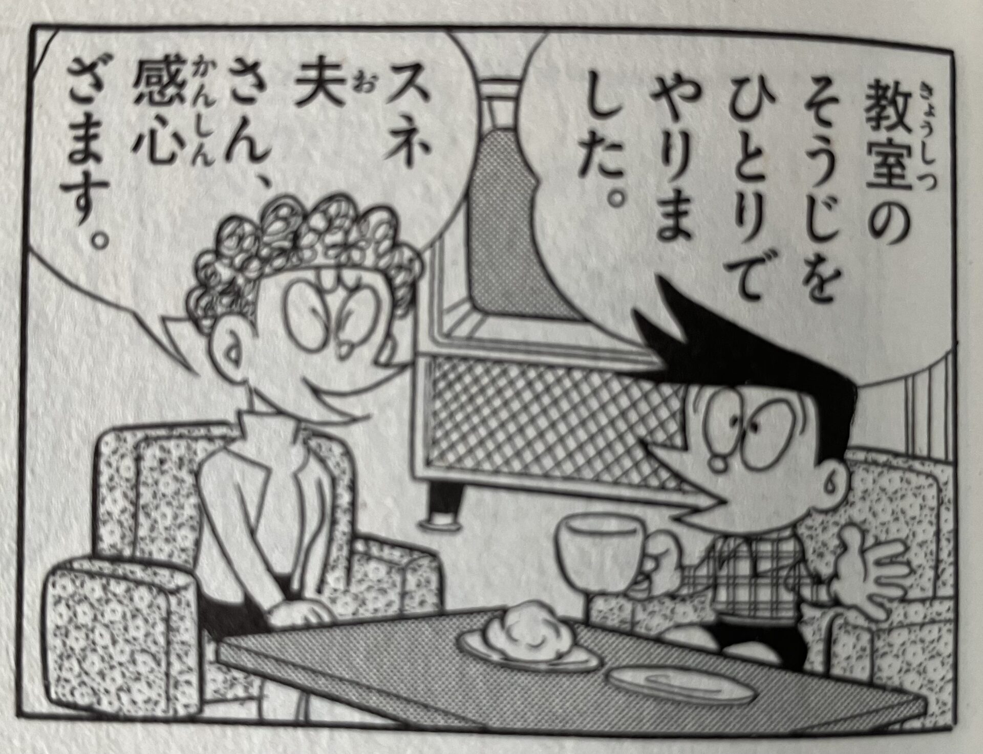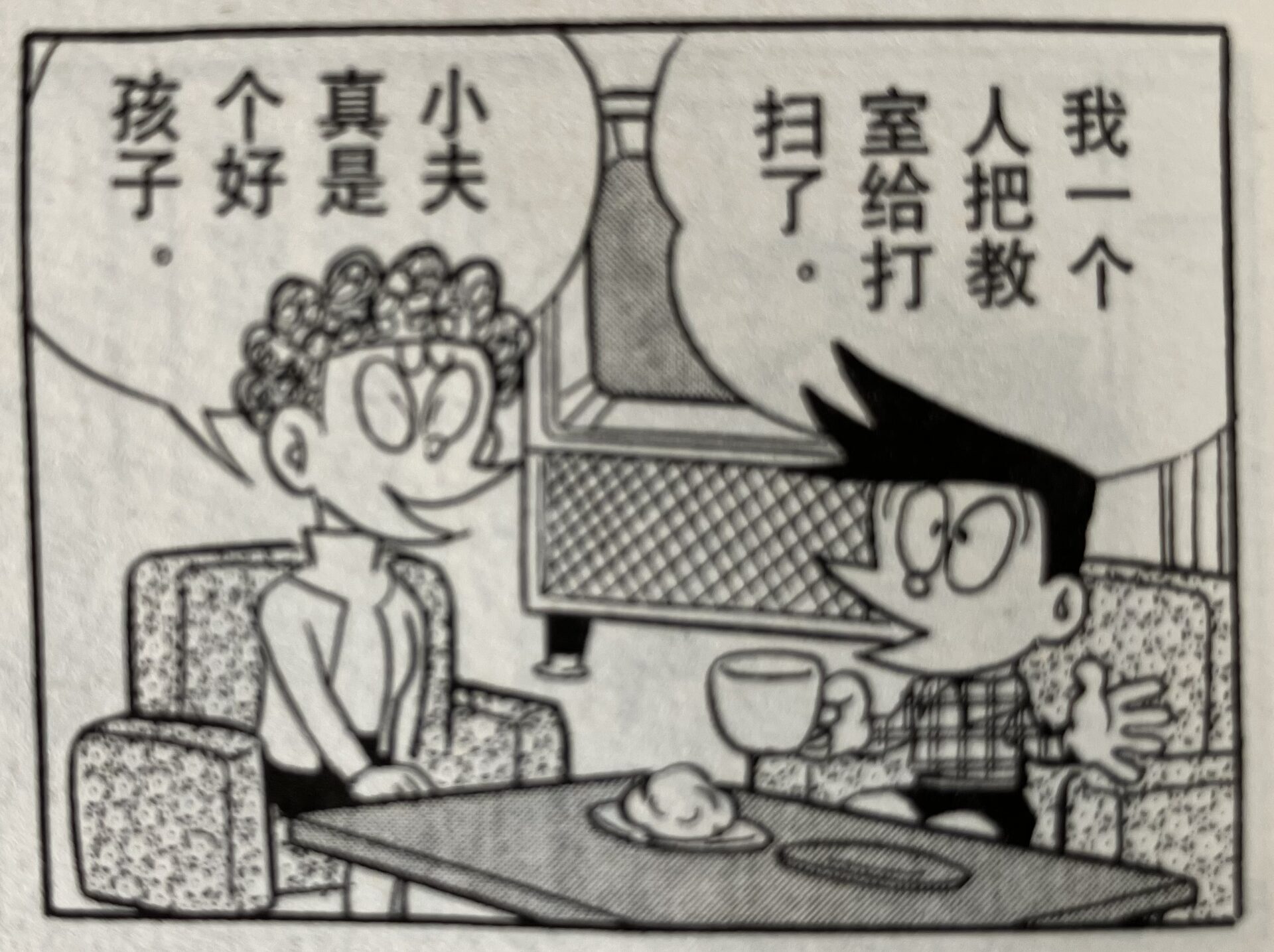 上のスネ夫の日本語のセリフ「教室のそうじをひとりでやりました。」を字面通り中国語に訳せば「我一个人打扫教室了。」となりますが、そこを敢えて「把構文」+「给+動詞」の「我一个人把给室打扫了。」という強調の形にすることで、自分の行いを自慢げに語っているニュアンスを表すことができます。多少大げさに訳せば、「このボクちゃんが、ひとりで教室を掃除したんだよ」という感じでしょうか。暗に「自分を褒めてほしい」とアピールしていることが、この構文が使われていることでも分かります。