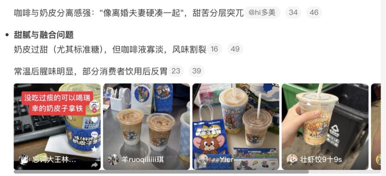 「奶皮子ラテは話題性は高いが、評価が大きく割れる商品。食感の新しさは消費者の許容ラインに触れるため、まずは“プリンなし版”を試すの失敗する確率を下げおすすめ。IPコラボ周辺商品で付加価値を楽しむのも一案。あっさり系を好む人には瑞幸の定番“生ココナッツシリーズ”が推奨される。」