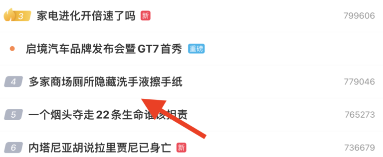 👉 本日の「微博热搜」でピックアップしたのは、“多家商场厕所隐藏洗手液擦手纸”です!