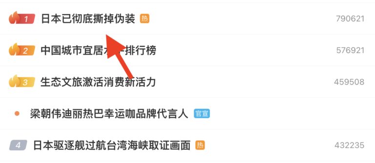 👉 本日の「微博热搜」でピックアップしたのは、“日本已彻底撕掉伪装”です!