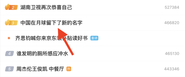 👉 本日の「微博热搜」でピックアップしたのは、“中国在月球留下了新的名字”です!